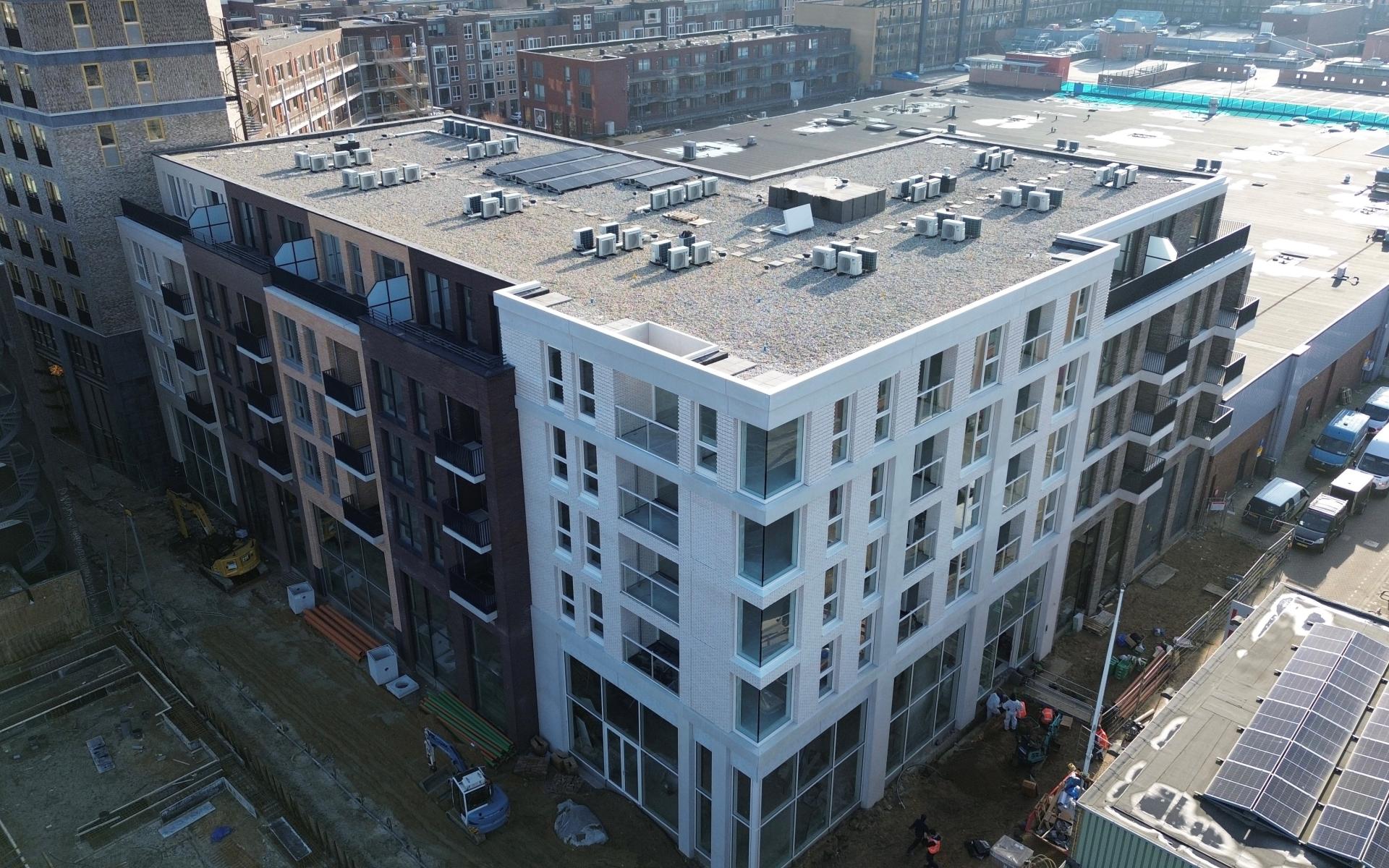 Na maanden hard werken op een drukke locatie is het hoogste punt bereikt bij project Corridor in het centrum van Veenendaal. Op vrijdag 11 juli is de plaat op de liftschacht geplaatst en daarmee is meteen het hoogste punt bereikt. Nu we de hoogte hebben bereikt is het tijd om te werken aan het interieur en het exterieur. Aan de achterzijde van het gebouw is de metselaar al druk bezig met het metselwerk van het exterieur. Binnen zijn we al begonnen aan de afwerking van de winkels en het versplein.