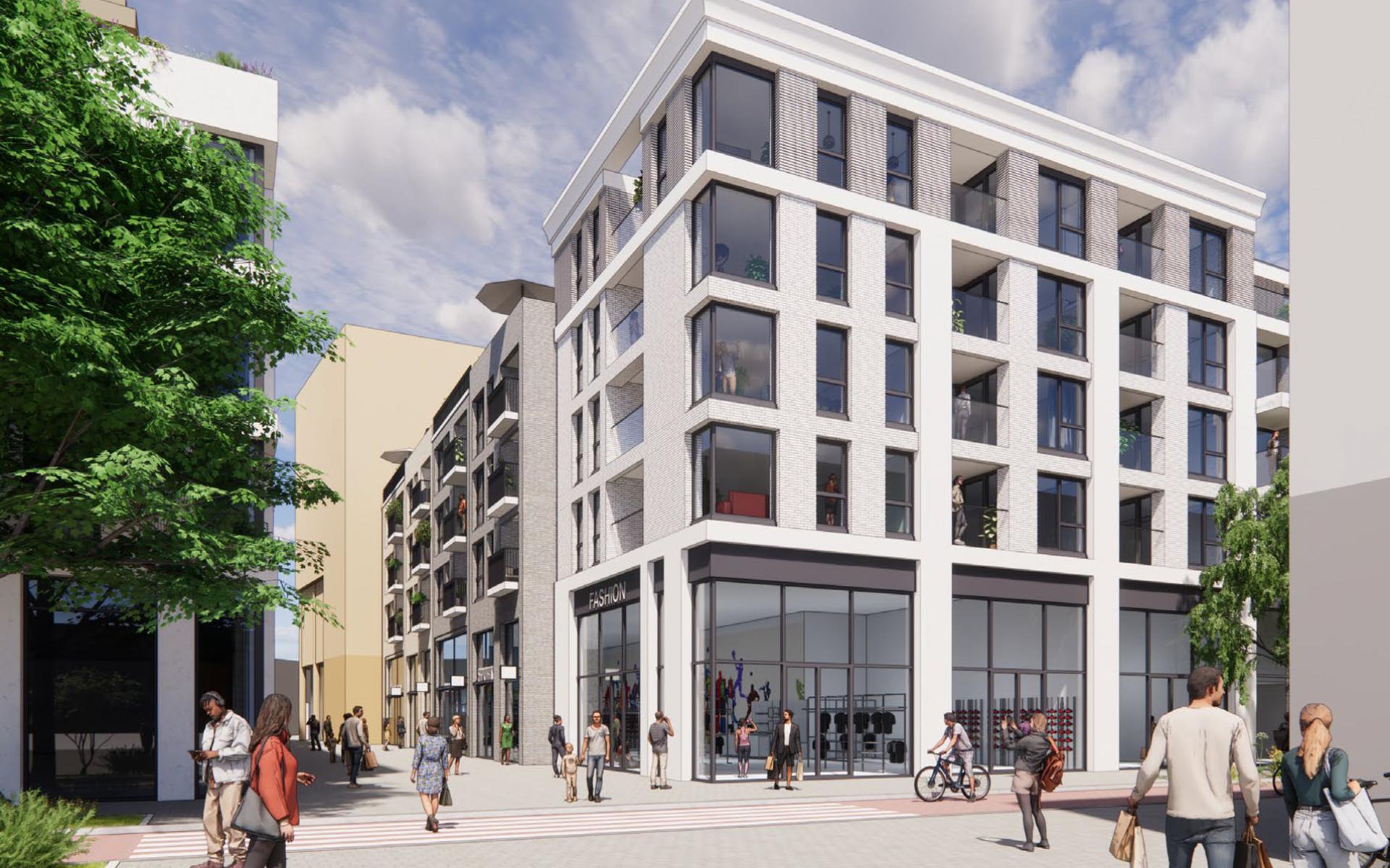 In fase 1 realiseren wij 56 huurwoningen met de natuur-inclusieve daktuin bovenop 2.100 m² nieuwe winkels en een versplein. Daarvoor is 2.500 m² bestaand winkeloppervlakte gesloopt.