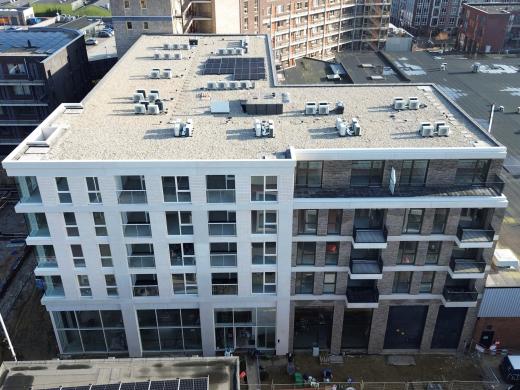 Het exterieur van het gebouw wordt langzaam zichtbaar. Aan de zijde van de binnentuin is de steiger al volledig weggehaald. Aan de zijde van de bouwplaats zijn we nog druk bezig met het metselwerk. Hier zijn we ook begonnen met het plaatsen van de prefab elementen aan de gevel.